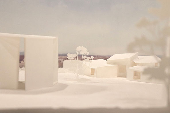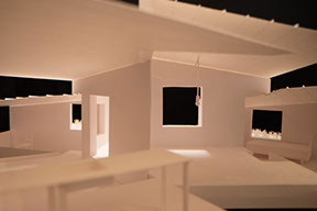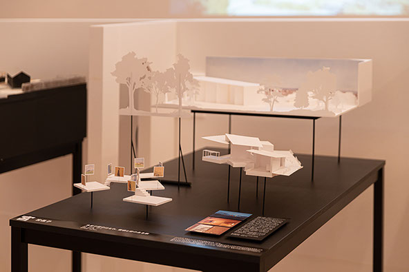 2020-21年にフランスで行われた「かたちが語るとき」展の関連企画展が、2021-22年にかけて神戸の“兵庫県立美術館”と横浜の“BankART Station”にて開催され、今回は新たに〈食堂の壁のはなれ、屋根と窓のある家〉を出展しました。フランスに出展した「食堂」から眺められるこの「家」は、見る人の“認識の主観”に働きかけ、遠近感や奥行感、実在感をゆらがせ心の中の像世界をつくりだします。その経験を、歩みを進める度に変化する庭での視界のように散在する「窓」、奥行とさまざまな仰俯角の視野を生む「断面」、シャドーボックスを応用した奥にいくほど小さく感じる心の「風景」の3つの模型で表現しました。