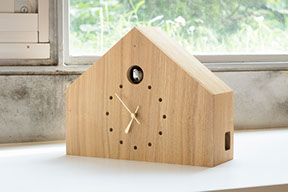 森の中にひっそりと建つ家のような、あるいは中世の素朴な教会のような佇まいを考えてシルエットをデザインしました。針は、カッコウの尾羽や教会のバラ窓の一部をモチーフとしています。それぞれの人のイメージで、いろいろなアナロジーの余地を残した時計。時計は正確に時を刻みますが、流れる時間のはやさは異なり、記憶の密度も異なります。そのような時間の風景に CUCULO FELICE がそっと寄り添い、カッコウが