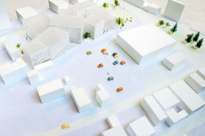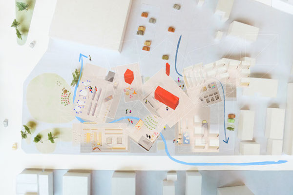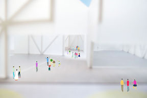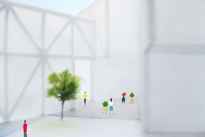 8つの棟をつなげながら分けていき、美術館が大きなそぶりで働きかけるのではなく、8棟が折り重なる間に入ってみたくなるようなすき間を、いろいろなところにつくりだしています。市役所や銀行、会社や学校の帰り道に自然に立ち寄れるように、街中からバリアなく美術館の中を通り抜けができる道もあります。