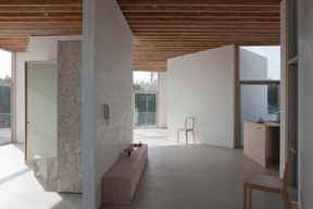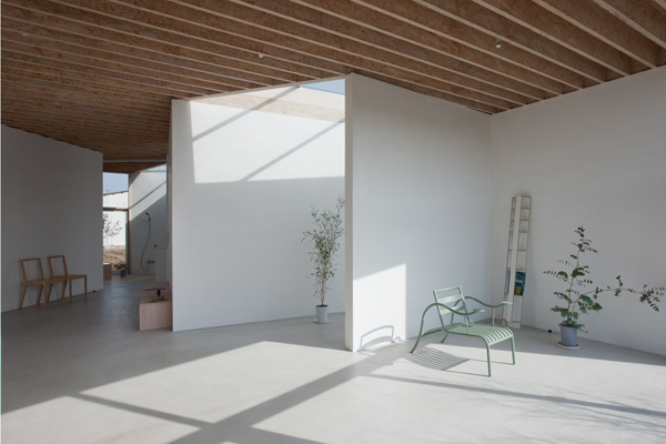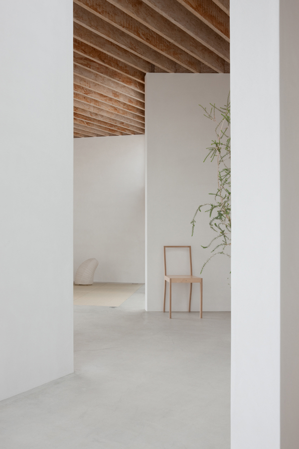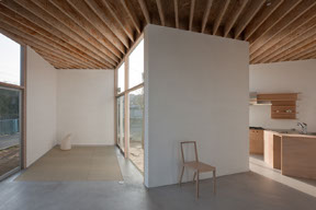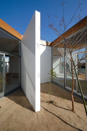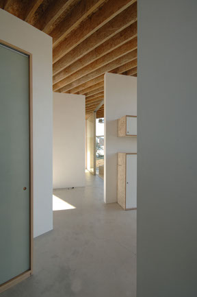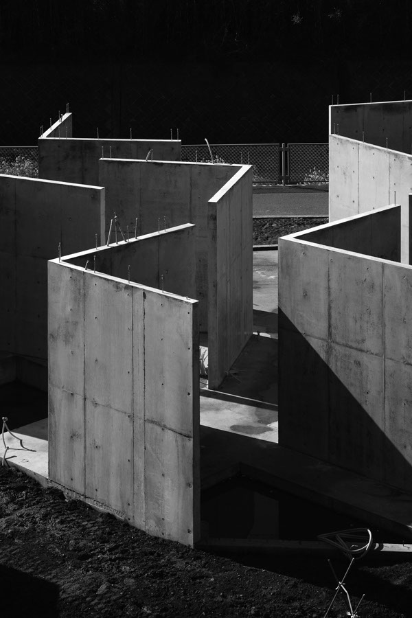 平面的にL型の壁は、完全に部屋として閉じることがなく、気配を伝え、多様な「隅」をつくり、ゆるやかに内外を隔てつなげていきます。外部にあるL型の壁は北風をふせぎながら南の光を受け止め、冬には日溜まりの小さな庭をいくつもつくりだします。