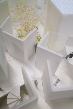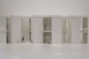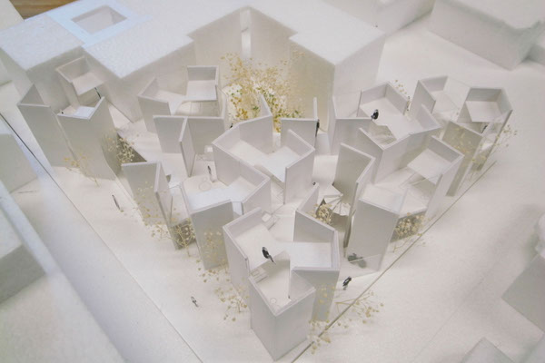 わたしたちは、新しく建てる集合住宅にもそのような余白をたくさんつくりだし、街とのつながりのある豊かな環境をつくりたいと考えました。平面は一辺2.4mのL壁を3つ一住戸に配置し、水周り、リビング、寝室の領域をつくりながら、余白を内外につくりだしていく提案です。