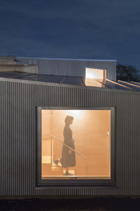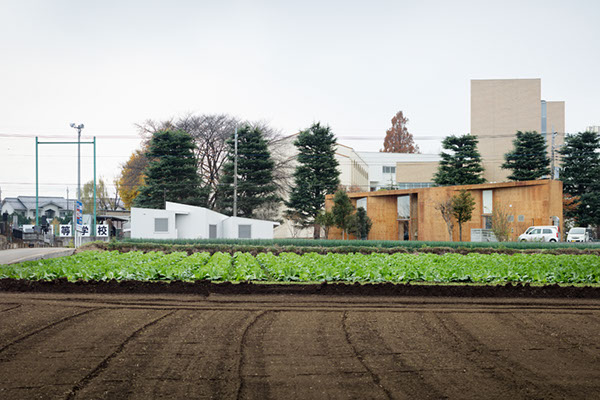 食堂から眺めたとき、絵本にでてくる家のような親しみやすさと不思議さを残しながら風景に溶け込んでほしいと考えて、背景にある家々と同じ「屋根と窓」のエレメントを独立後はじめて用いました。