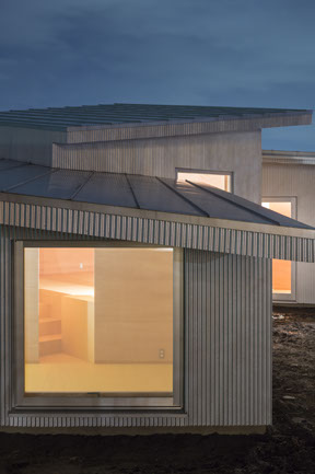 小さな家を4つに分けて、半地下をつくることで屋根の一番低いところを人の背丈よりも低く。屋根は対角に流し、食堂側に向けて、キュビズムの絵のように遠近感を圧縮して家を背景に退かせ。窓は小窓によく用いられる突き出しの形を、小さな家の割に大きなサイズで。すべて同じものを用いながら、地面が全面に見下ろせたり、目線近くに来たり、空だけが見通せたり、身体との関係性で異なる大きさの存在に。