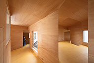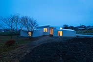 赤城山を望む、牧歌的でさまざまな大きさの自然物や建物が広がるードサイド。「食堂」から眺められる家は、誰のものでもなく、平凡で、どこか想像の中の絵本の家のような表情でありたい、と考えた。遠景にある家々と同じ屋根や窓を用い、大きさや見える角度を変えて、心の中に像世界を描きつづける。"風景"の模型を手前の3本の木々から覗くと、食堂越しに「家」が見える。それは同時に異なる面を見せるキュビズム絵画のように小さく分岐し、敷地の隅に吹き寄せられている。屋根は低いところで1.4mと人の肩ほどにあり、すべて食堂に向かって対角に傾く。家は食堂から遠のいて見え、背景の家に退いていく。窓はそれに比して1.2m角と大きく、近づく人を包み込む。奥行と時間はつねに主観と客観の間にある。模型では、シャドーボックスを応用し、その感覚を心理スケールで表現した。"断面"では、折り重なる壁と対角に傾く天井、そして堀込まれた床が洞窟のよう奥行とさまざまな仰俯角の視野を生み、身体の感受性を満たしつづける。"窓"は、歩みを進める度に変化する庭での視界のように散在し、風景は身体によって主体的に再構成される。窓の外を眺めているのに、どこか知らないソトの世界に包まれていく。